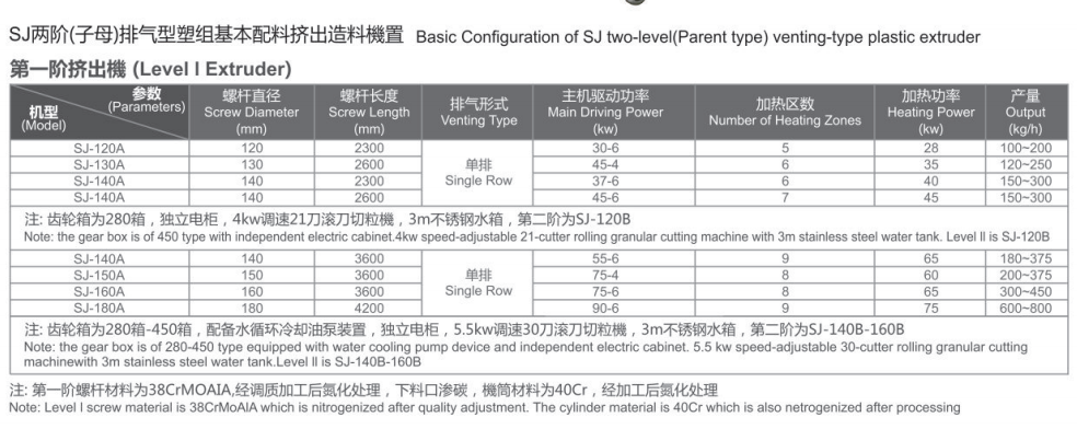 我公司生产的挤出機采用不同的螺杆设计,适用于多种塑料的再生造粉,螺杆料筒经特殊的硬化处理,具有耐磨性,高产能特性,两阶(子母)排气型塑料按出造粒機组有“丁字型”排列设计,两挤出现都设计有排气和快速更换滤网装置,可重复将物料加热后产生的气体排出并经过两次过滤将物料的杂质过滤使造出来的颗粒更结实、光滑、纯净。此机最适合于ABS、聚苯乙烯(PS)、高压聚乙稀(LDPE),低压聚乙烯(HDPE),聚丙烯(PP)等再生挤出造粒。部份机型参照国外技术及按我国实际情况而设计,已被广大客户采用。